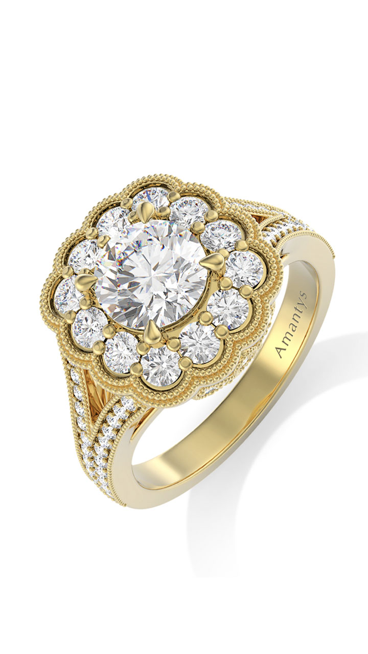 D’inspiration florale, cette création réalisée à la demande d’un client est spectaculaire de par sa brillance due à l’entourage du diamant central taille Brillant de 1.00 Carat, de Couleur G et de Clarté VS2 ainsi que par son sertissage de l’anneau en fourche. De plus, son panier très sophistiqué travaillé à la perfection par nos artisans joaillers accentue cette splendeur.
