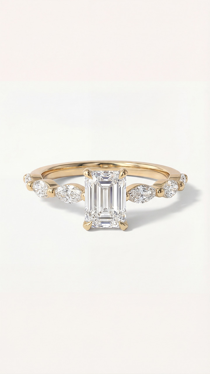 Audacieuse et délicate, la bague de fiançailles Marquise Émeraude marie deux lignes d’expression joaillière pour créer une silhouette sculpturale : un diamant taille Émeraude de 1.00 Ct de qualité F/G SI1, pur et graphique, se pose au centre comme un trait de lumière parfaitement dessiné.