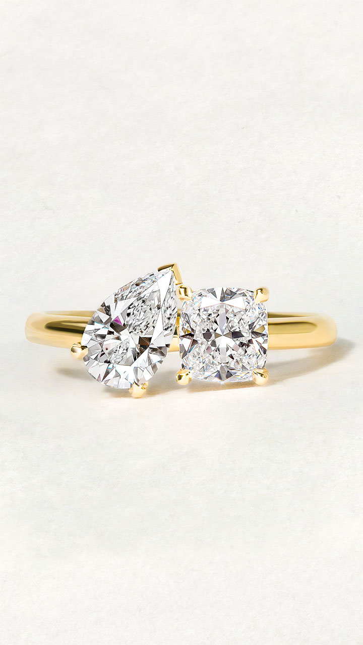 L'inspiration de cette création provient de l'iconique design joaillier "Toi et Moi". Il s'agit d'une bague dans laquelle deux diamants de volume similaire se juxtaposent. Ici, un diamant de taille Poire de 0,70 Carat est positionné à côté d'un diamant de taille Coussin de 0,90 Carat. Le corps de bague est volontairement simple afin de mettre en les diamants en exergue.