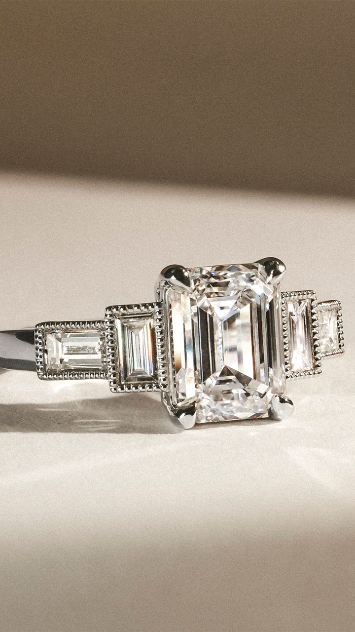 Cette bague incarne le charme intemporel de l'élégance Art Déco, mettant en valeur un diamant central taille Émeraude de 1.50 Carat d'une pureté D/E VS2 et d'une brillance remarquables. Sertie en Or Blanc 18K, la monture rehausse l'éclat de la pierre centrale, entourée de diamants taille Baguette, disposés avec précision pour créer une symétrie parfaite. Les détails délicats de la monture, rehaussés de griffes en Or Blanc 18K et de finitions grainées, ajoutent une touche vintage à ce bijou de caractère.