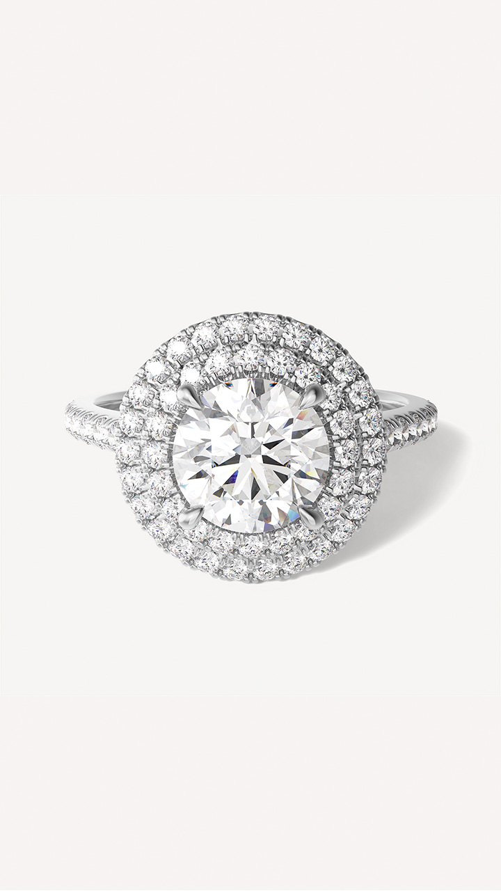 Pour cette création joaillière Éblouissante, la Maison Amantys revisite son modèle iconique la Délicate en ajoutant un halo de diamants supplémentaire. La double ceinture de diamants met en valeur la pierre centrale en sublimant son volume. L'anneau pavé de diamants de cette bague halo lui apporte une ultime touche scintillante.