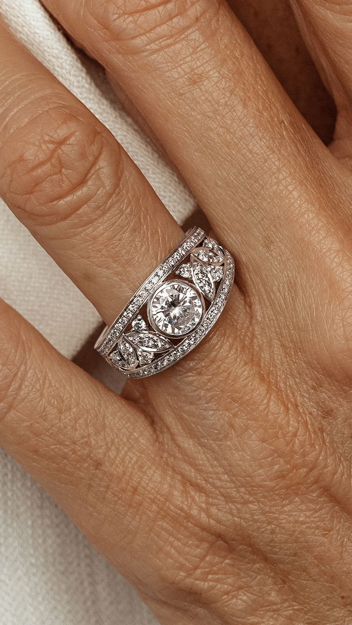 Pour cette bague de fiançailles, nous nous sommes directement inspirés du mouvement Art Déco. Radieuse est ornée d’un diamant central Taille Brillant mis en valeur par un serti clos et accompagné de détails marquises et de fines lignes de pavage.
