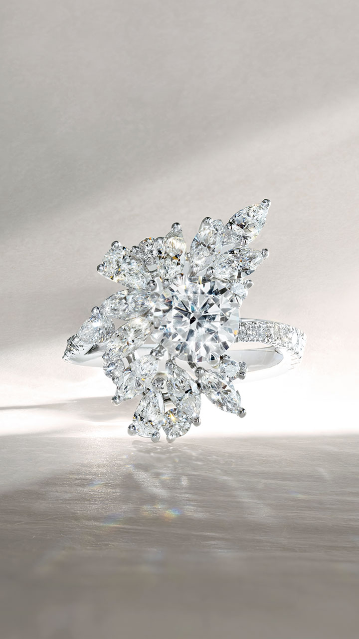 Cette bague somptueuse est une véritable ode à l’élégance et à la beauté florale, incarnant la quintessence de la Haute Joaillerie. Au cœur de cette création, un diamant Brillant de 1.00 Carat d'une pureté et d'un éclat exceptionnels resplendit, entouré d’un magnifique bouquet de diamants taille Marquise, Brillant et Poire disposés comme des pétales délicats. Ce design floral raffiné crée un jeu de lumière spectaculaire qui attire irrésistiblement le regard.