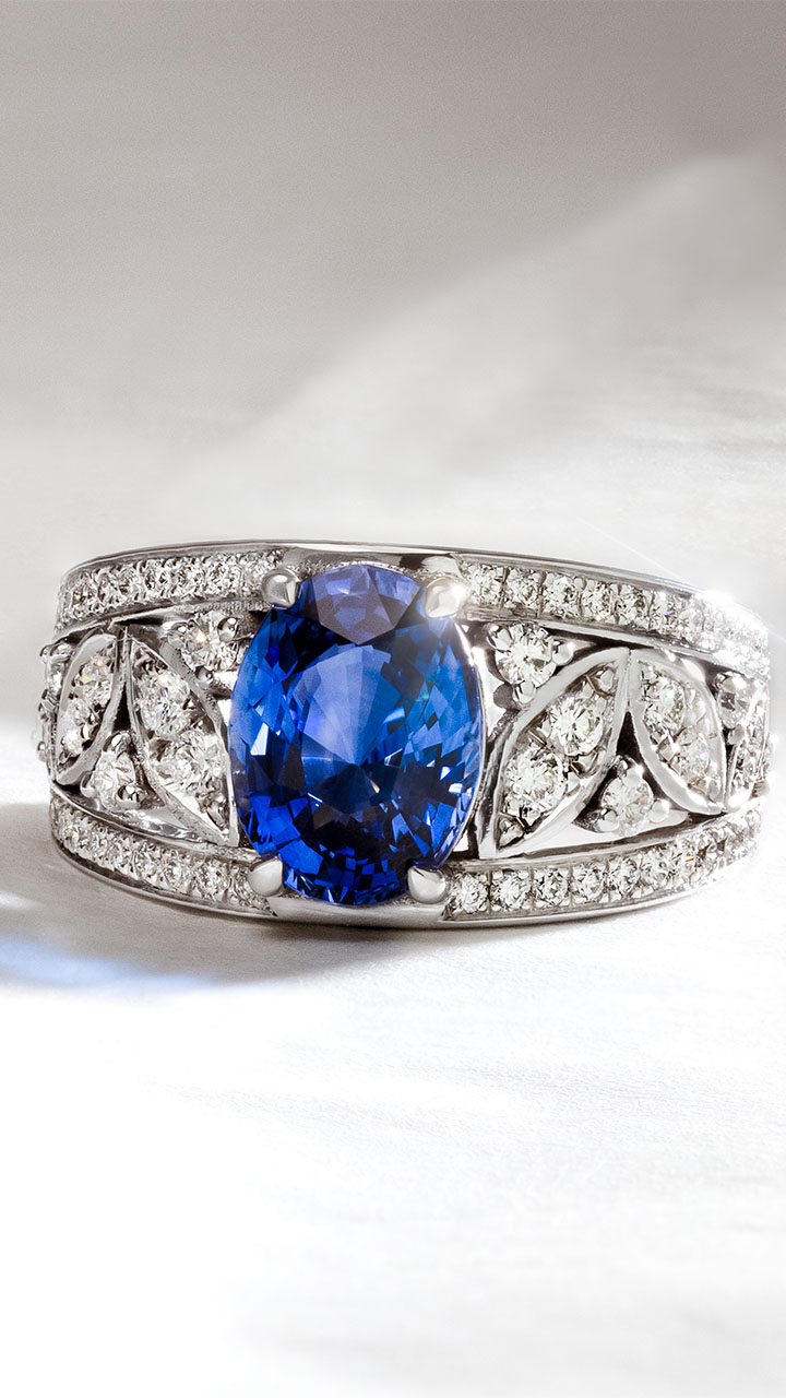 Nos artisans joailliers ont revisité le modèle de bague en diamants Radieuse avec pour pierre centrale un Saphir Ceylan taille Ovale de 0,55 Carat. Le bleu intense du joyau est mis en valeur par une composition de diamants qui se déploie sur l'ensemble du corps de bague.