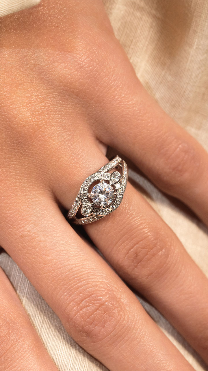 Nous avons travaillé la bague de fiançailles Éclatante dans les moindres détails. Nous avons ajouté quelques ornements autour de la pierre de centre taille Brillant de 0.50 Carat : un entourage en serti dit “grain” et deux détails taille poire. Et pour maximiser le volume, nous avons joué sur un léger ajourage entre votre pierre de centre et l’entourage.