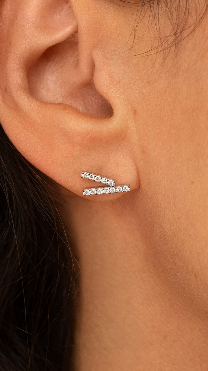 Les boucles d'oreilles Virtuoses dessinent une lettre V légèrement déstructurée et pavée de diamants taille brillant. La composition se distingue par son originalité tout en préservant une certaine discrétion.