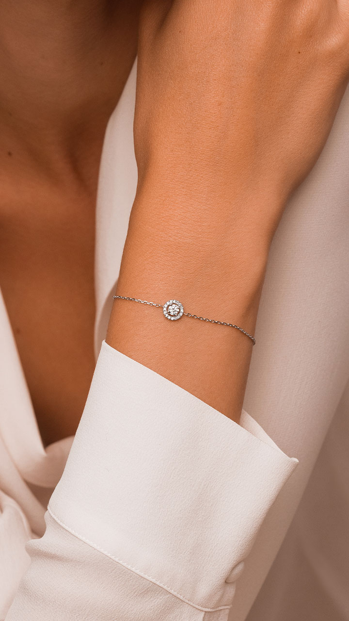 Le Bracelet Délicat est la déclinaison joaillière de la bague de fiançailles iconique du même nom. Comme l’incontournable de la Maison, le diamant central en G/H SI2 de cette création est entouré d’un Halo scintillant. La technique joaillière du micro-serti donne un aspect aérien à l’ensemble pour un rendu intemporel et élégant.