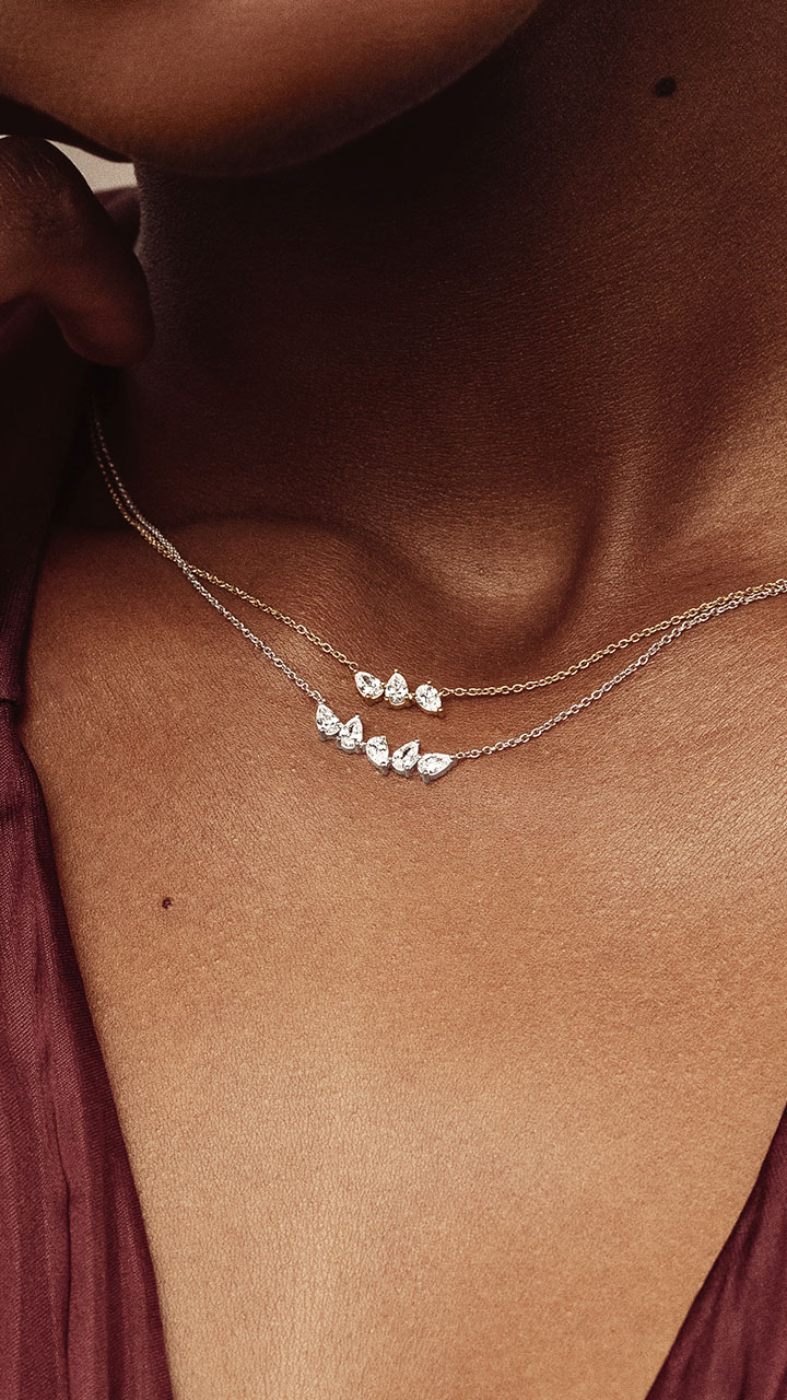 Cinq diamants taillés en poire se se déploient sur une ligne subtilement désordonnée. Ce collier Audacieux 5 poires totalise 0,53 Carat de diamants naturels, sélectionnés par les artisans joailliers pour conjuguer brillance et volume grâce à la forme en poire.