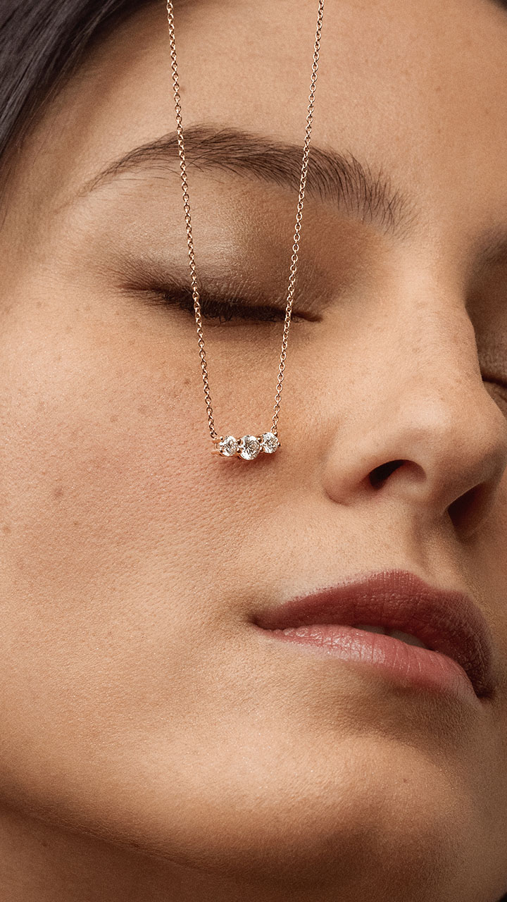 Parfait, une trilogie de diamants pour illuminer votre cou. Le choix des artisans joailliers : une association de diamants taille Brillant pour un éclat maximal. Ce collier sur-mesure s'affirme comme un cadeau chargé de sens par sa composition ; il est l'accessoire parfait pour célébrer une naissance.