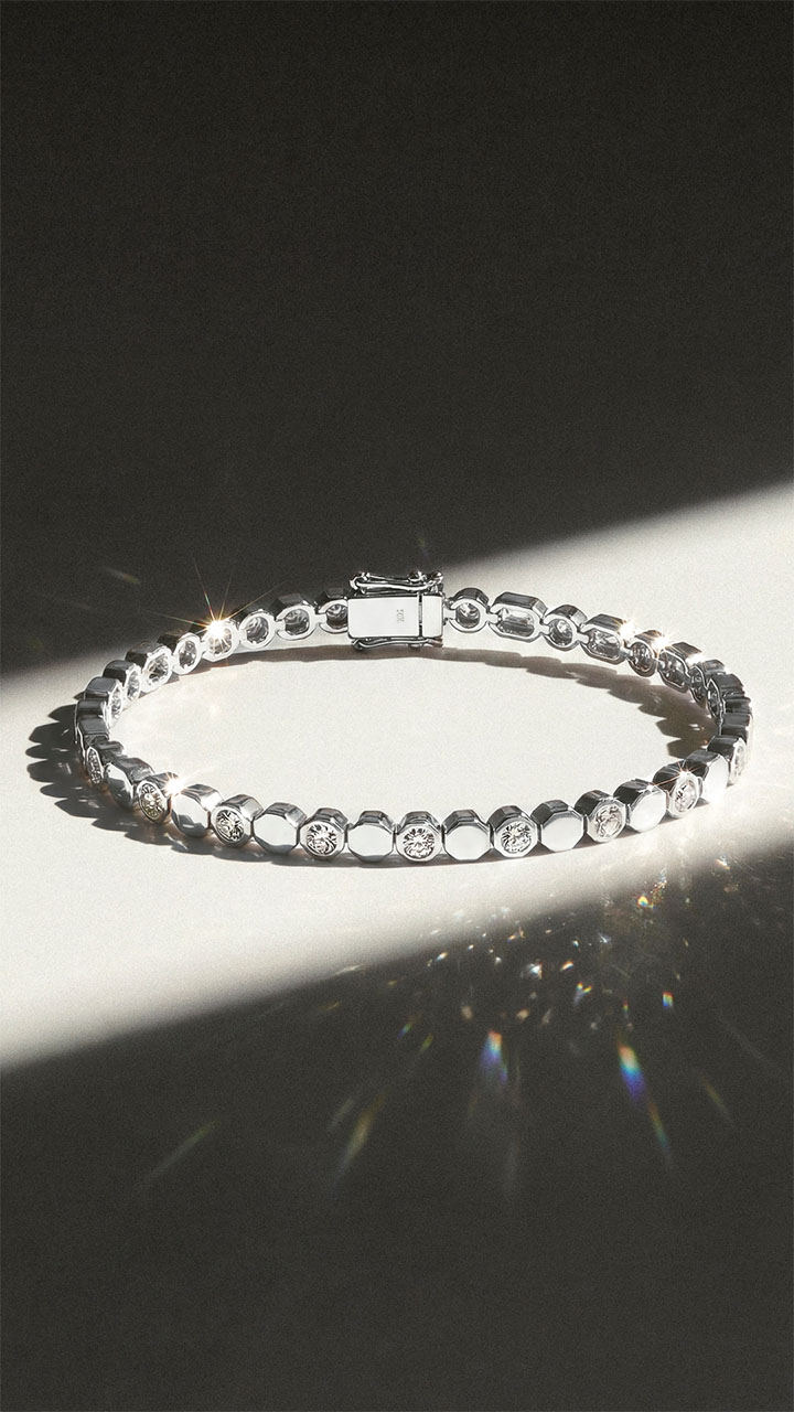 Ce bracelet unisexe, inspiré du classique bracelet Rivière, marie harmonieusement l'Or blanc palladié 18k à des détails octogonaux distinctifs. Les diamants naturels taille brillant, sertis avec soin, offrent une brillance raffinéee et mesurée.