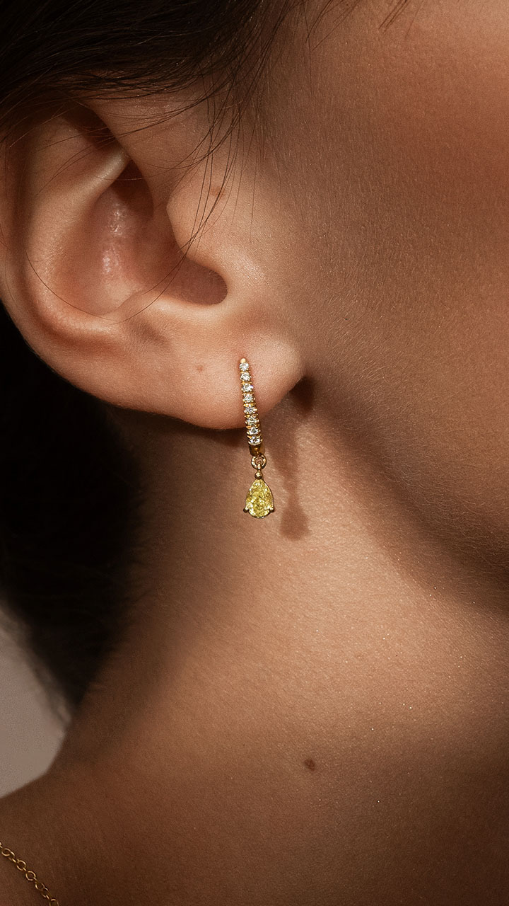 C’est une pièce aussi unique qu’éthique que notre client a imaginé en collaboration avec les artisans joailliers de la Maison. Façonnée à la main à Paris, ce sont 8 diamants taille Brillant serti micro griffes et un diamant Taille Poire Fancy Yellow 0.10 Carat de qualité F/G SI1 qui scintillent sur une monture en Or jaune 18k recyclé.